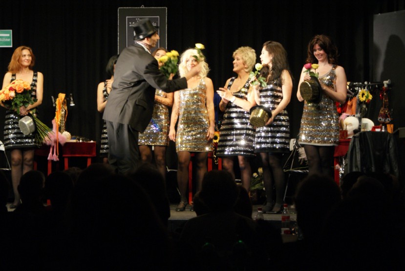 Das Stück „Lampenfieber“ der Erwachsenengruppe „Synthese“ ist eine Krimi- Komödie, mit mehr als einem doppelten Boden. Die Zuschauer sitzen an kleinen Variététischen und befinden sich mitten im Theaterstück, welches auf drei Bühnen spielt.