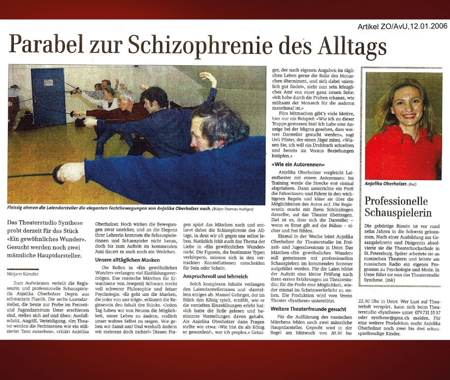 Посещение репетиции спектакля «Обыкновенное чудо».Газета «Zürcher Oberländer»/ Объявления Устера, 12.01.2006 г. Автор: Мирьям Кюнцлер.