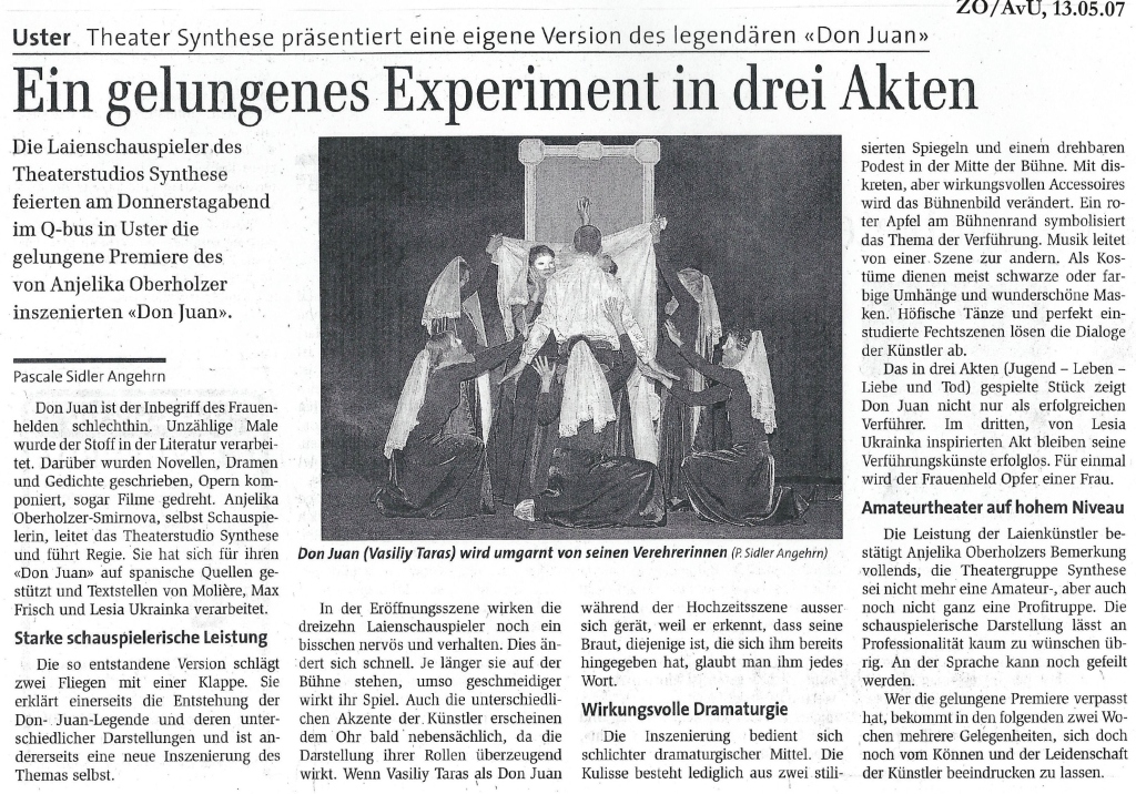 О спектакле «Дон Жуан».Газета «Zürcher Oberländer»/ Anzeige von Uster, 13.05.2007г. Автор: Паскаль Зидлер Ангерн.