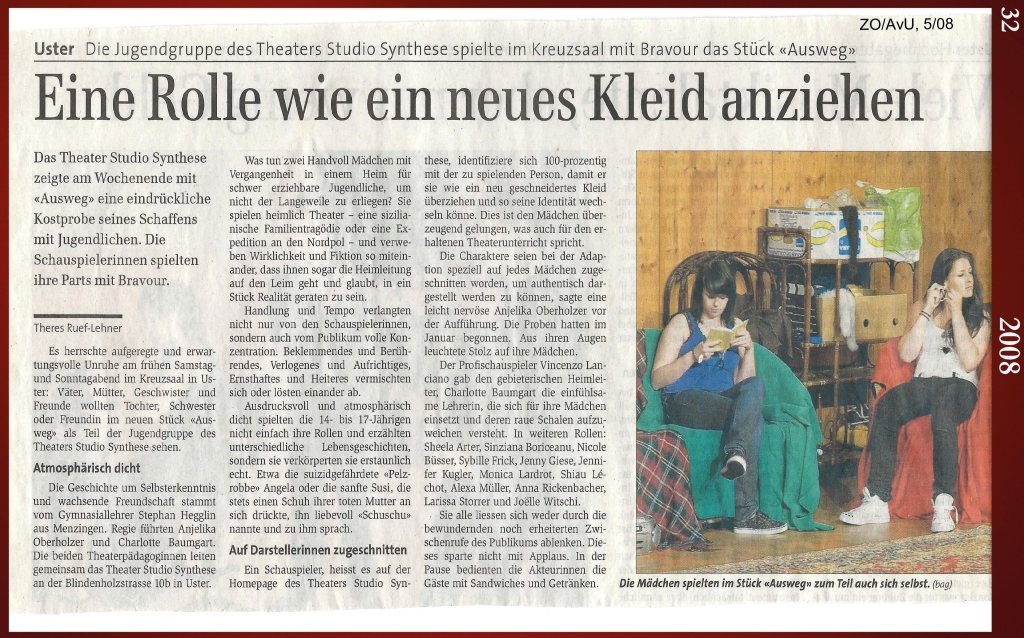 О спектакле «Выход» по пьесе С.Хегглин-Бессмера. Газета «Zürcher Oberländer»/ Anzeige von Uster, 05.05.2008г. Автор: Терез Рюф-Ленер.