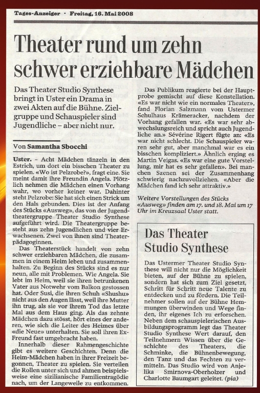 О спектакле «Выход» по пьесе С.Хегглин-Бессмера. Журнал «Tages-Anzeige», 16.05.08г. Автор: Саманта Сбоччи.
